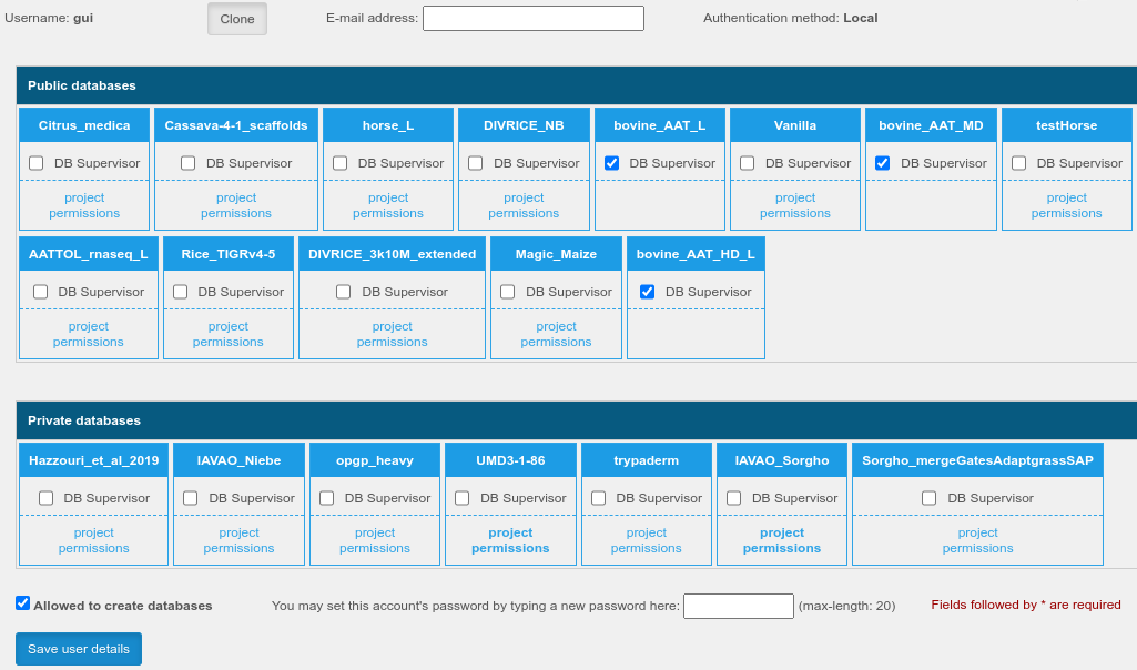 By clicking on a magnifier icon, any user who has at least the project manager role can configure other user's access to the data he manages. As of v2.9, when logged in as administrator, from that same user permission management page, it is possible to grant users the right to create permanent databases by ticking the "Allowed to create databases" box. When they do create a new permanent database, those users are automatically granted the supervisor role on it (i.e., all actions allowed).