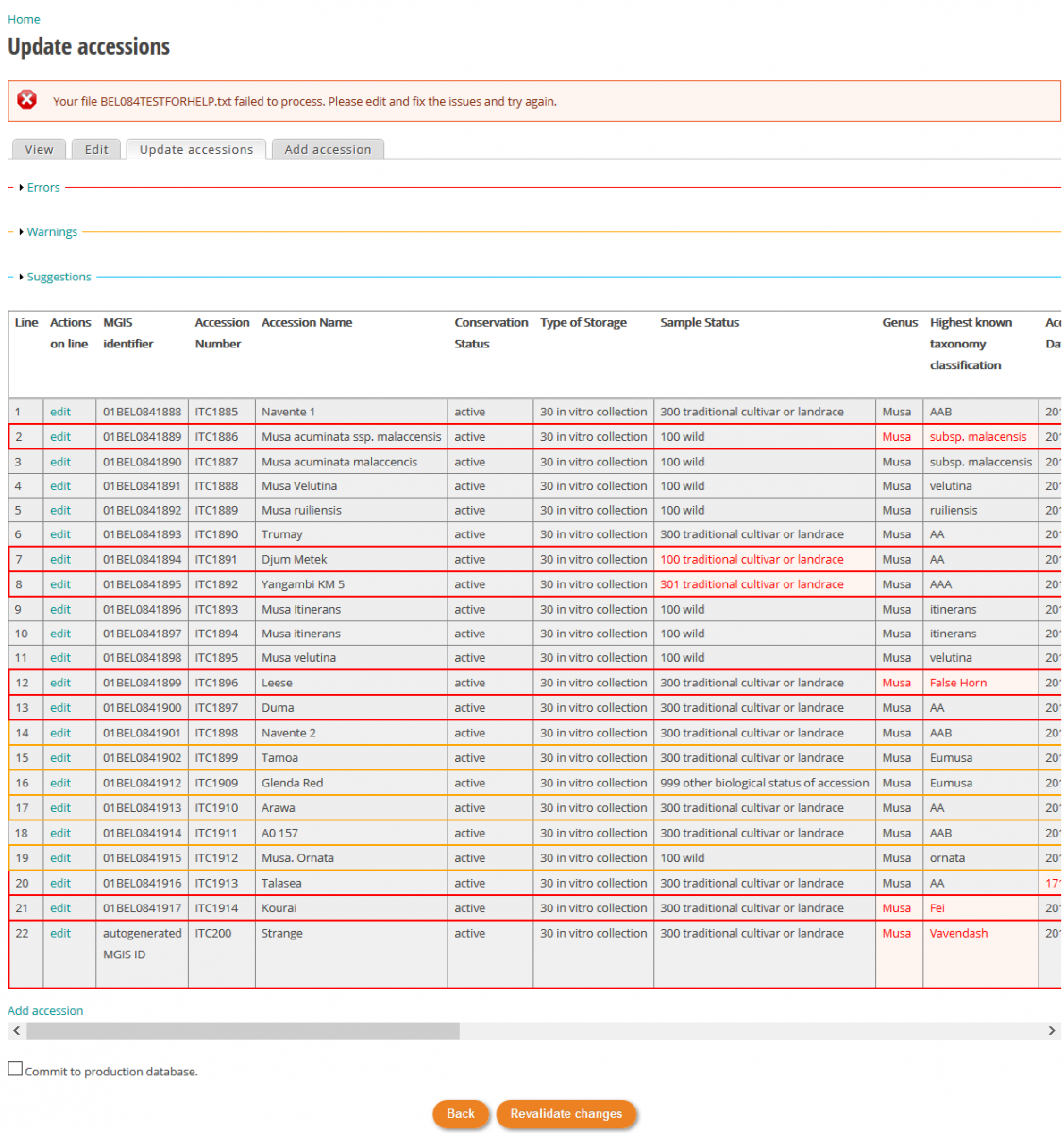 The Error level lists the error that prevent to go further and upload data onto the web site. You should correct those errors in priority. In the example above the line containing error(s) are framed by red borders and the erroneous data is red colored (e.g : on line 2 subsp. Malacencis instead of malaccensis).