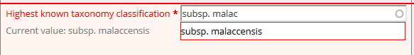In case the passport data already exists in the database the current value for this field is mentioned in grey characters, in our example subsp. Malaccensis.